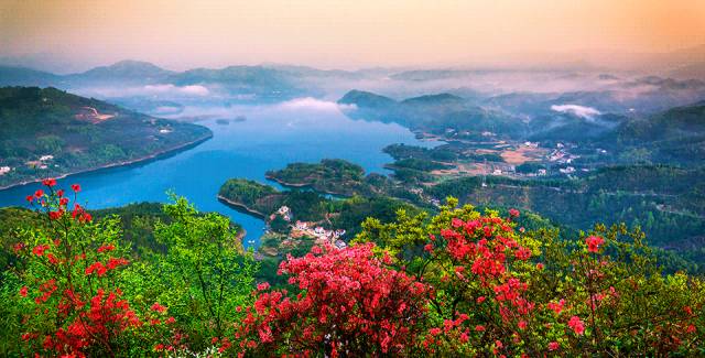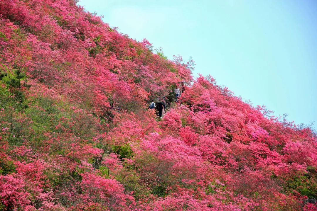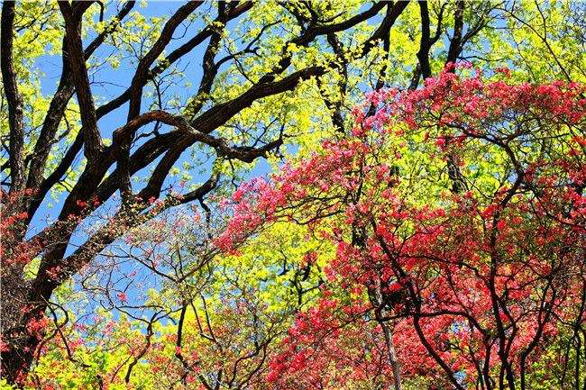 每年四月中下旬,当整个大别山还体现着“草色遥看近却无”的早春景象时,大别山主峰白马尖的映山红便已次第开放,辉映山谷。如今,正值映山红盛开期,漫山遍野,到处是盛开的花朵和待放的花苞,在蓝天白云的映衬下,紫的,红的,让人心醉无比。