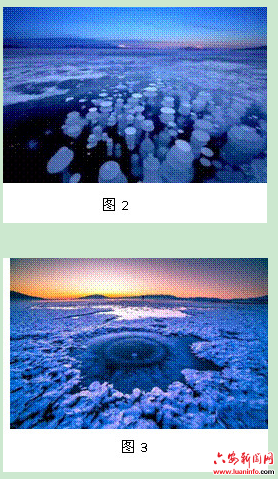 (4)风力。风对结冰的影响比较复杂。位于新疆西部的赛里木湖的“冰泡湖”(图2)美景,是在冬季低温时遇大风而成。图2中奇观的形成过程为:受寒潮低温和大风的影响,气温骤降,水温降至冰点以下,湖水冰封的速度远大于气泡上升的速度,气泡被封在蓝冰之中。赛里木湖北部因靠山一侧风力较大,水温下降速度更快,靠近湖区北岸的冰泡较密。如果湖面冰冻后,出现风暴,冰层被刮破,冰块随风移动,遇冷后形成冰坝,原位置水面则重新结冰,形成冰眼(图3)。“冰泡湖”奇观,在世界其他纬度较高的山区湖泊也会出现,如加拿大的亚伯拉罕湖、俄罗斯的贝加尔湖等。以上分析了强冷大风对结冰的影响。但如果水面结冰较薄,大风吹破冰块,水的流动速度增大,则不易结冰。