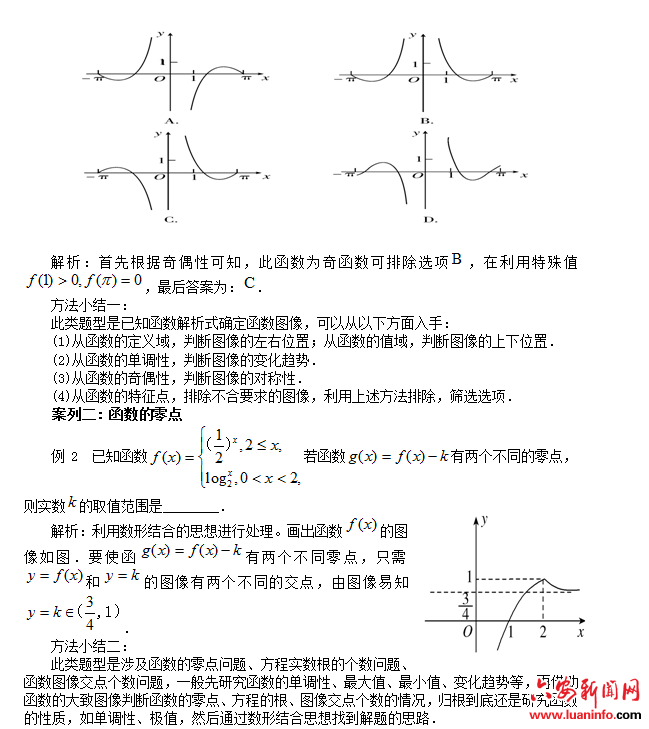 (2)用图像法讨论方程(特别是含参数的方程)的解的个数是一种行之有效的方法,值得注意的是首先要把方程两边的代数式看作是两个函数的表达式(有时可能先作适当调整,以便于作图),然后作出两个函数的图像,由图求解。