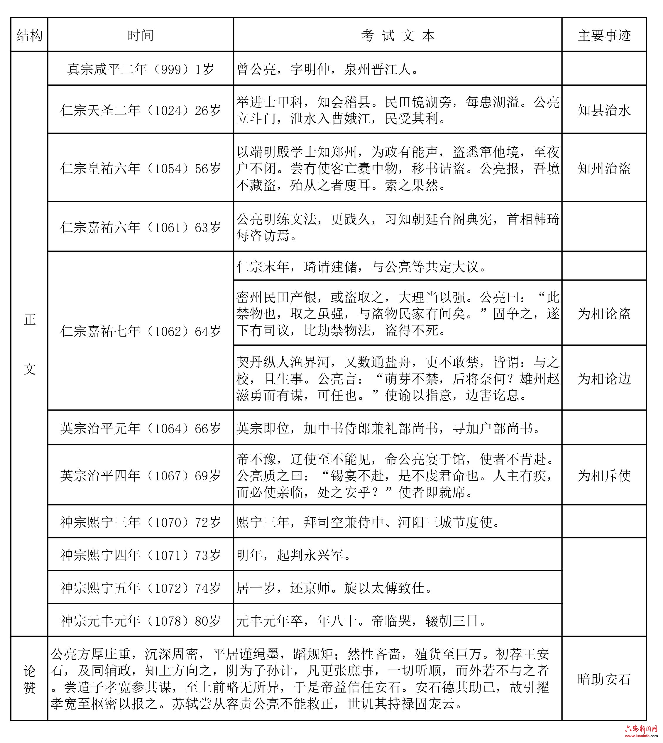 《曾公亮传》选自《宋史》,原文约1100字,试卷中删定为不足600字。文章保留了正史的传记体例,有正文和论赞两部分。以文章结构和传主年龄为纲目,文章可重排段落为: