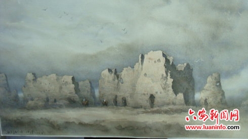 另外,邹老还十分注重对广阔空间和无限空间的表现。在其《西行怀古》中——茫茫大漠,空旷渺远,巍巍城堡,静穆苍凉。邹老只用一两种颜色,利用其色彩纯度的无限递进性,把画面的空间推向了无限。空间的表现决定一幅作品的感染力,这种空间的形成除了形象的透视外,主要靠空气感而产生的色彩透视。由于空气中含有蒸气和尘埃,这就造成了空气的色彩和半透明状。高明的画家就是紧紧抓住了空气之中同一物体的不同色彩:清晰与模糊;冷与暖;固有色的明与灰等细致入微的表达,从而使画面产生了无穷而深远的苍茫境界。这幅画作充分显示了邹老精湛的技术素质和长期浸淫其间的学术水准——在水彩中表现了流动、透明的生命,表现了空气情感和生命运动,让无法言语转瞬即逝的流光变成了永恒,令人流连迷醉。